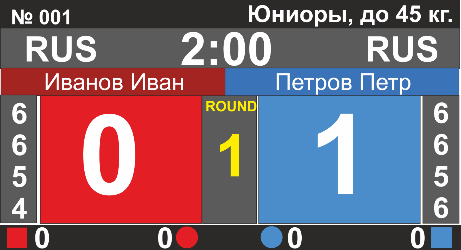 В режиме реального времени отображается состояние счета, а так же работа судейской бригады (опционально)